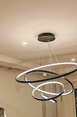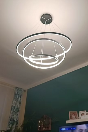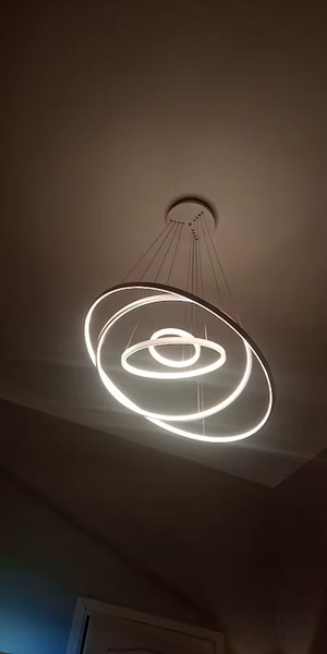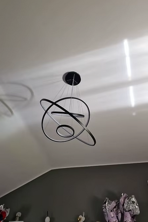 De svävande ringarna skapar en dynamisk rörelse i rummet och ger ett skulpturalt uttryck som känns både modernt och exklusivt.